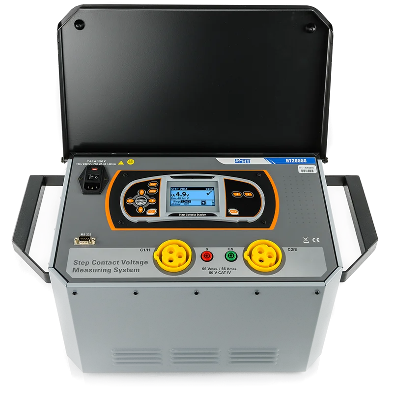 HT2055 est composé d’une unité de puissance et d’une unité voltmétrique nécessaires pour l’exécution des mesures de tension de pas et de contact dans les installations électriques industrielles (systèmes TN, cabines de transformation) avec un courant d’essai nominal jusqu’à 50A.